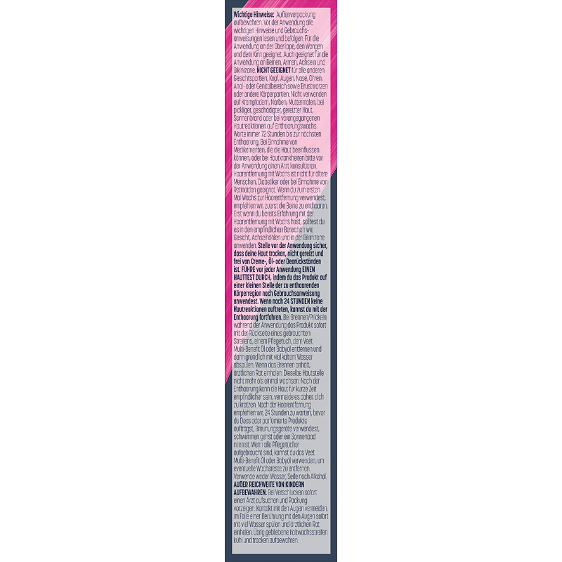 Dich stört dein kleiner Damenbart und du möchtest ihn loswerden, ohne jeden Tag zum Rasierer zu greifen? Mit den Veet Expert Kaltwachsstreifen speziell für das Gesicht kannst du die feinen Haare auf Oberlippe, Kinn oder Wangen langanhaltend entfernen – ohne störende Stoppelbildung. Die Kaltwachsstreifen wurden für eine präzise Anbringung an den empfindlichen Bereichen des Gesichts konzipiert und sind selbst für sensible Haut geeignet. Durch die speziell entworfene Easygrip-Lasche kannst du die Streifen noch leichter abziehen und selbst kürzeste Haare ab 1,5 mm mühelos von der Wurzel an entfernen. Sie sorgen bis zu 28 Tage für seidig glatte Haut und enthalten wertvolles, pflegendes Mandelöl. Die Pflegetücher mit Arganöl entfernen Wachsreste und sorgen für ein strahlendes, gepflegtes Finish. How-To-Videos erleichtern die dir die Anwendung – für ein optimales Ergebnis in nur 4 einfachen Schritten.